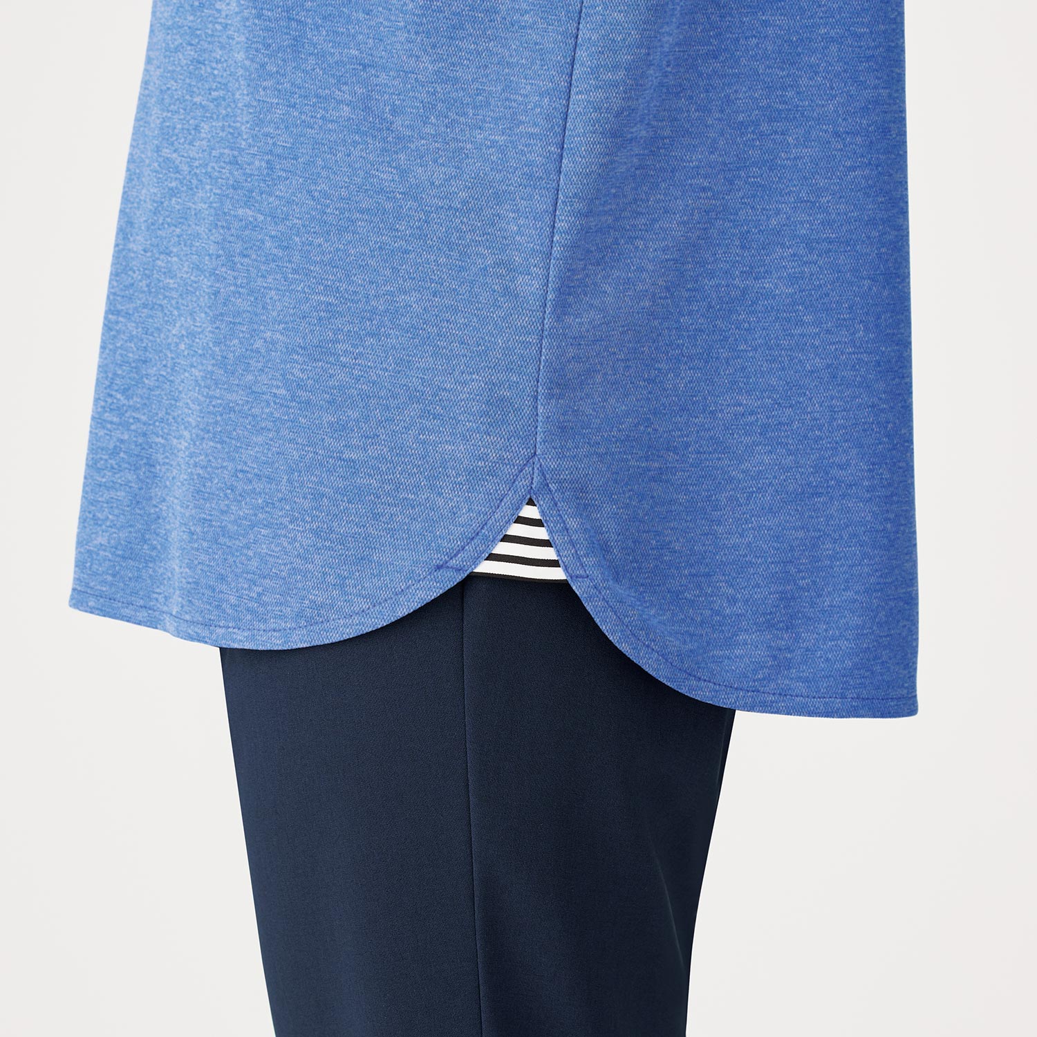 立体感のある台襟つきの首元と、シャツ風のやわらかなヘムラインが程よいきちんと感を演出。